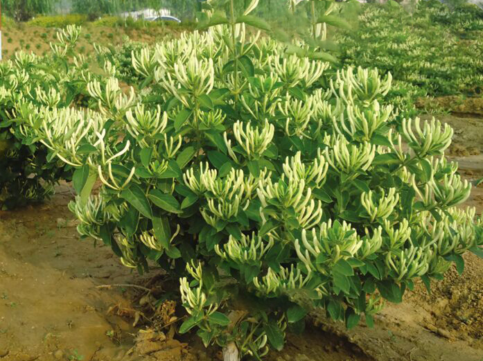 (4)籬架吊蔓形 在金銀花行間樹立部分水泥桿,在水泥桿之間拉上鋼絲,將金銀花枝蔓用布條牽引到鋼絲上,形成類似栽植葡萄的種植模式。株行距為0.5米×1.5米,單株定植,每畝栽苗888株。 籬架吊蔓栽培,適宜在土質肥沃的平原地塊采用。由于吊蔓立體生長,可充分利用立體空間,通風透光,產量高,質量好,又便于采花和修剪。本模式需要一定的輔助設施投資,管理用工也有所增加。 6、施肥 每年追施1-2次有機肥料。肥料的種類主要有:腐熟發酵的人糞尿,豬、羊、牛、兔、雞等動物的糞便,植物(含雜草)秸稈、漚制的綠肥、沼肥、發酵的豆肥、菜籽餅、豆餅等餅肥、正規廠家生產的有機肥等。 7、澆水 如果有水澆條件,要在金銀花遇到干旱的時候及時澆水。在金銀花種植園中設置微灌、滴灌設施,更能保證金銀花良好生長。 對雨期的澇漬金銀花園,要及時排水防澇。 8、除草 一年中要多次清除雜草,防止地塊荒蕪,妨害金銀花生長。采取旋耕除草機和人工除草(耪地)相結合的辦法,可提高除草效率。 9、防治病蟲害 在金銀花的栽培管理中,對金銀花危害最嚴重的害蟲有蚜蟲、蠐螬、尺蠖等幾種,病害主要是白粉病、根腐病。 主要防治措施: (1)按每10畝的面積,安裝一盞高頻紫外誘蟲燈,可誘殺死大部分害蟲的成蟲。 (2)用植物源、微生物源、微生物等生物制劑、礦物性制品,防治病蟲害。 10、整形修剪 金銀花是一種多年生植物,喜通風透光,怕枝條密擠;喜溫暖干燥,怕陰冷潮濕。結過花的枝條不能再孕蕾開花,只有在新生枝條上才能萌生花蕾。金銀花如果長年不修剪,枝條密擠纏繞,墩內郁閉,病蟲多發,不但花蕾產量低,質量也差。因此要對金銀花適時修剪。 要針對不同的栽培模式和造形要求,采取不同的修剪方法。 (1)簇墩形