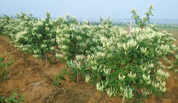 三、九間棚“六不用”金銀花栽培管理技術 1、品種選擇 選擇北花一號、九豐一號、九豐二號等金銀花優良品種,為主栽品種。 種苗標準:品種純正,根系較完整,苗高30cm左右。一年生苗地表直徑0.3-0.5cm左右,兩年生苗地表直徑0.51cm—0.8cm,大苗地表直徑在0.8cm以上。分為裸根苗和營養缽苗兩種規格,正常管理情況下種苗栽植成活率在95%以上。 2、地塊選擇 以光照充足、土質疏松、具有灌溉和排水條件的地塊最為適宜。荒山丘陵、溝邊地堰、廢棄礦場、沙丘灘地、城鎮綠地等處均可種植金銀花。 3、地塊整理 對種植金銀花的地塊要耕翻整理,清除較大的石塊、地膜等異物。平原地區、低洼地塊可采取畦田或起壟方式種植,以利澆水和排澇;山區丘陵可根據地勢,沿等高線起壟或挖魚鱗坑栽植,以利保土蓄水;溝邊地堰、廢棄礦場可采取分散挖穴或客土回填等方式,對栽植地塊或穴坑進行整理,確保穴坑內有適量松散土壤,以利保水保肥,提高栽植成活率。 4、種苗定植 原則上一年四季只要土地不封凍,都可栽植金銀花,但尤以早春土壤解凍后和晚秋土壤封凍前栽植最好。 栽植時挖長、寬、深各20厘米左右的穴坑,放入苗木,保持直立狀態,覆上疏松細土并壓緊踏實,澆足水,待水下滲無明水后,再培土封墩,恢復壟形或整成穴盤。苗木栽植培土后,地下部分深度以15厘米左右為宜。苗木栽植時一般不在穴中直接施用肥料,待緩苗生根后再追施有機肥料。這樣要求的主要目的,就是為了避免燒苗和影響緩苗期生長。 5、栽植模式 主要采取“簇墩形、主干樹形、立桿輔助形、籬架吊蔓形”四種栽植模式。 (1)簇墩形 金銀花枝蔓簇狀成墩,呈半圓頭形分布于地面之上。一般墩行距為1米×1.5米,每畝栽444墩,每墩栽苗2-3株。 簇墩形適于山區丘陵地塊以及風沙地、地邊地堰等采用,是“中國金銀花之鄉”——山東省平邑縣的主要栽培模式。在平原地塊采用簇墩形需起壟或畦田栽植。本模式省工省事,管理技術較為簡便。同時,由于每墩栽植多株金銀花苗,定植后這些金銀花又在其根部或觸地的匍匐枝蔓上不斷萌發出更多的新生根枝條,具有自我更新、連綿不斷的旺盛生命力,即使其中個別植株或枝條因病蟲危害等原因出現枯死,對整墩金銀花而言也影響不大。這也是山東省平邑縣金銀花產業歷經數百年而長盛不衰的因素之一。