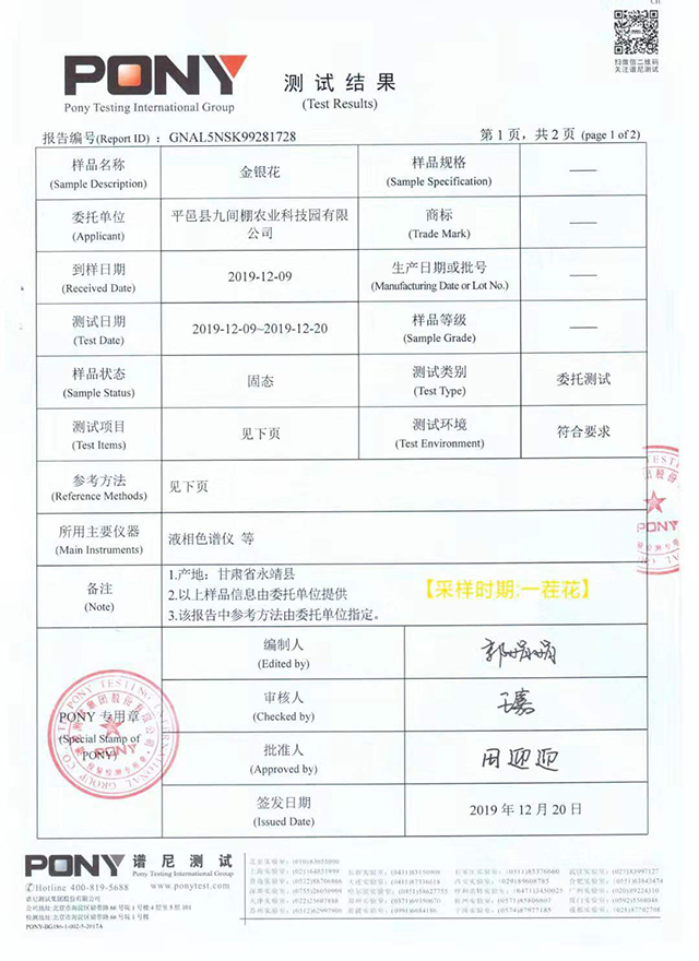 “北花一號”金銀花不含山銀花成分檢測報告(甘肅樣品)