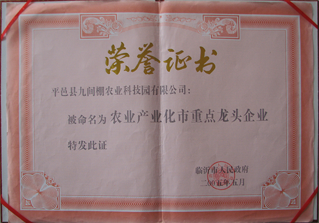 2005年5月,九間棚農業科技園公司被評為農業產業化市重點龍頭企業。