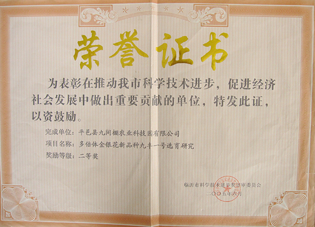 2005年6月,“九豐一號”金銀花被評為科學進步獎二等獎