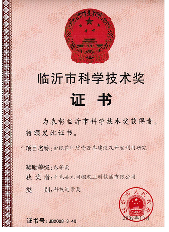 2009年10月,金銀花種質(zhì)資源庫建設(shè)開發(fā)臨沂市科學(xué)技術(shù)獎(jiǎng)
